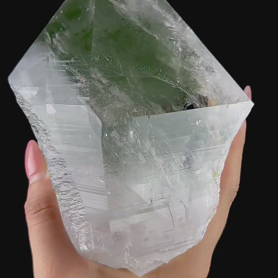 Large clear Quartz point with green Chlorite inclusions. Lemurian Quartz with a phantom-like Chlorite inclusion adds a beautiful touch of color